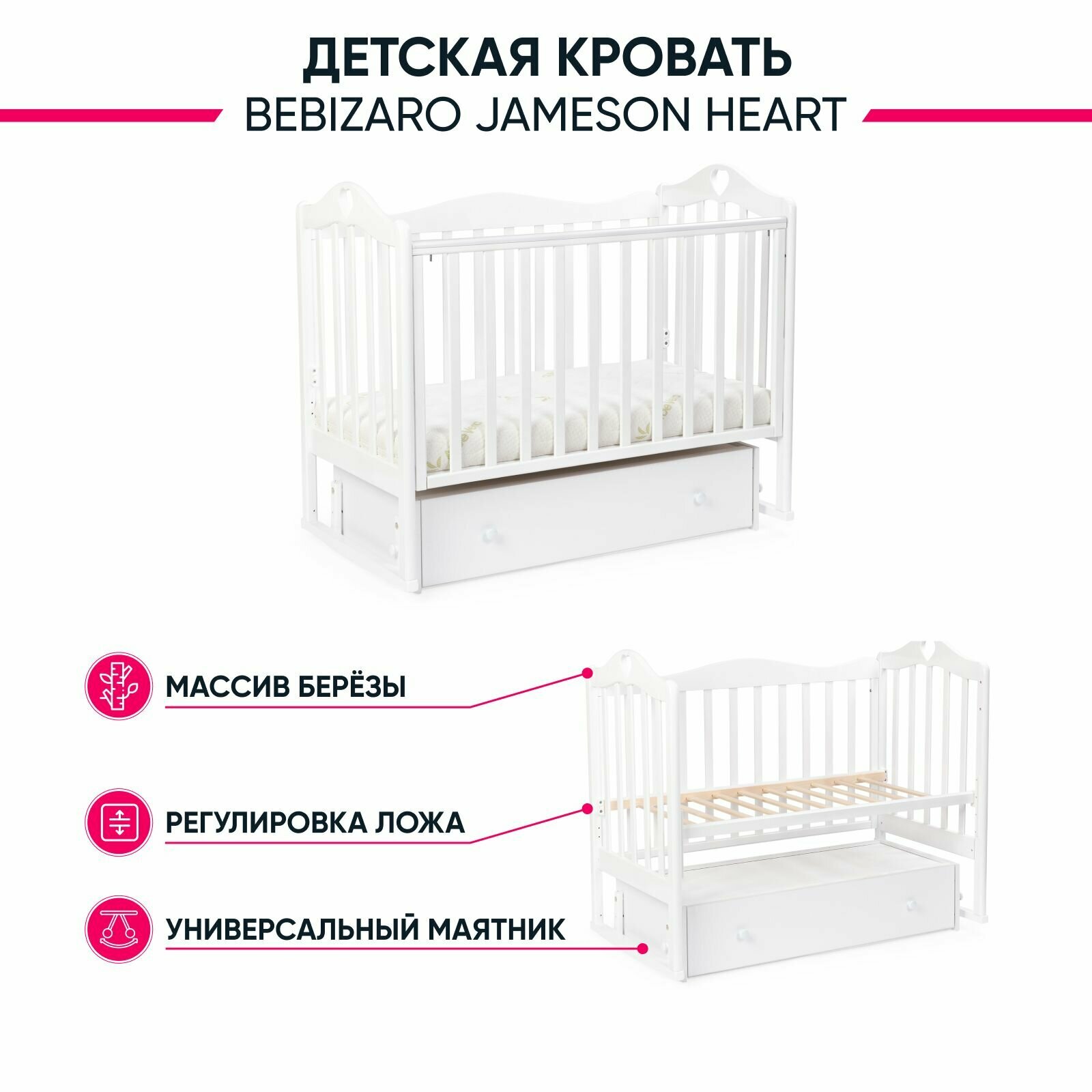Лучшие цены. Детская кровать BEBIZARO JAMESON «HEART» – с универсальным маятником и ящиком. Это стильная и много функциональная кроватка, продуманная до мелочей, это максимальный комфорт и безопасность для вашего малыша. Каркас кроватки выполнен из массива берёзы. Для удобства родителям, боковая стенка кроватки регулируется по высоте. Модель оборудована вместительным и практичным ящиком для хранения. Особенности: · маятник универсальный (продольный и поперечный). Магазины в вашем городе.