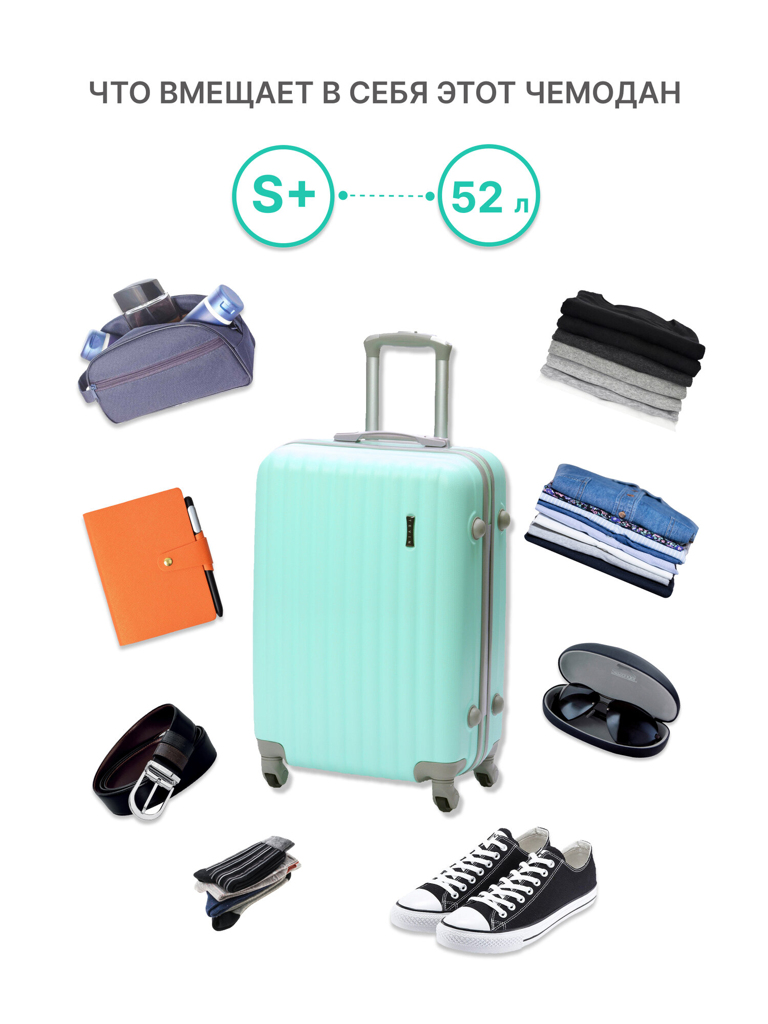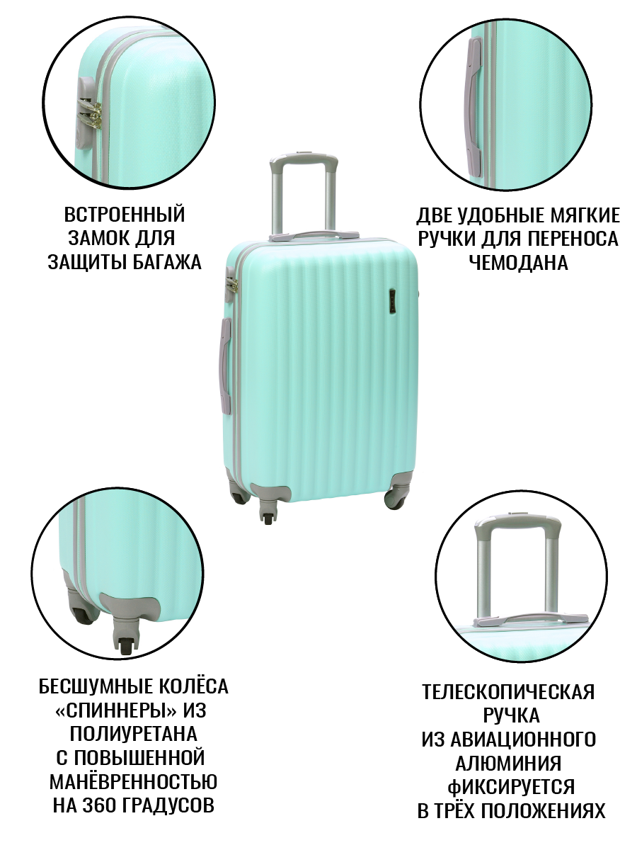 Чемоданы Чемодан на колесах дорожный средний багаж для путешествий для девочки s+ TEVIN размер С+ 60 см 52 л легкий и прочный abs (абс) пластик Зеленый мятный