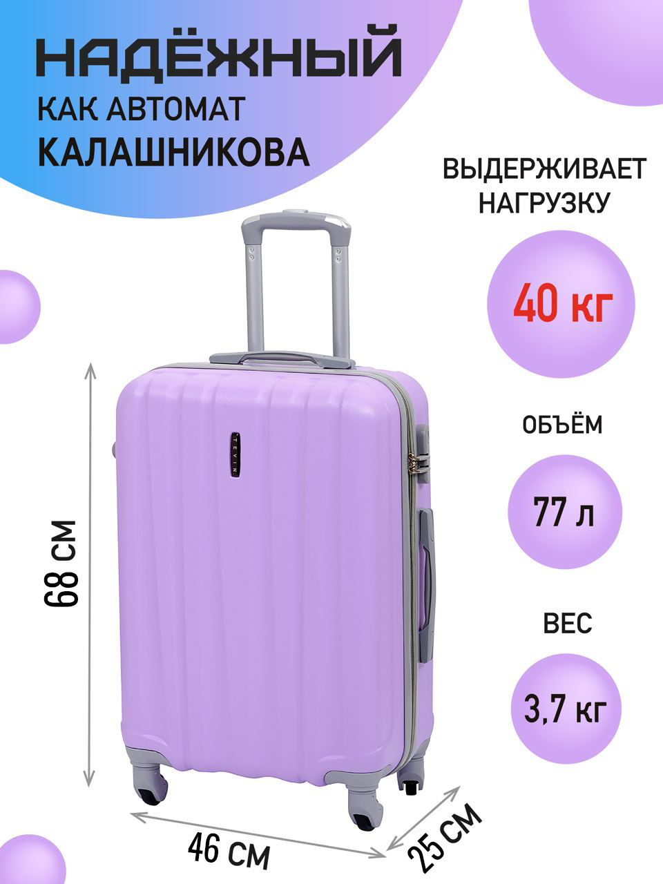 Чемодан на колесах дорожный большой m+ TEVIN размер М+ 68 см 77 л abs пластик ФиолетовыйЧемодан на колесах дорожный средний багаж на двоих для путешествий женский m+ TEVIN размер М+ 68 см 77 л легкий прочный abs (абс) пластик Фиолетовый