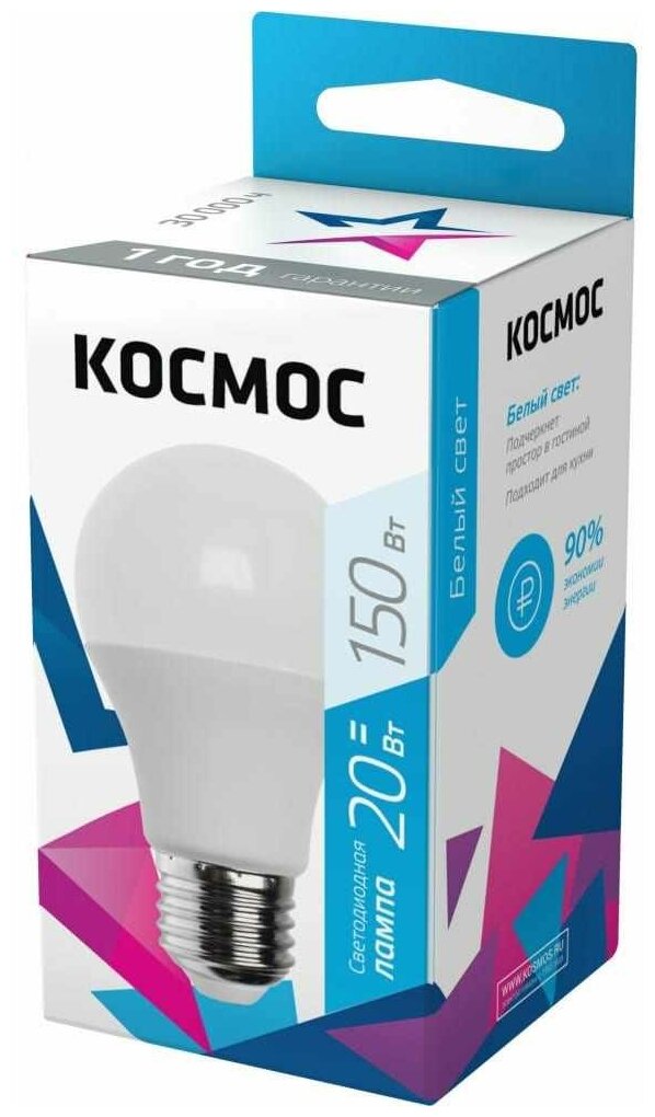Лампочка светодиодная А60 Космос, 20Вт 220В, цоколь Е27, белый свет 6500К, 1 шт.