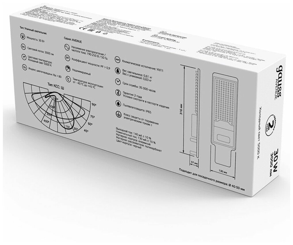 "Gauss светильник светодиодн. уличный консольный 30W(3000lm) 5000K 6K 316x130x57 IP65 ""Ш"" 2года Avenue 629534330 (арт. 771623)"