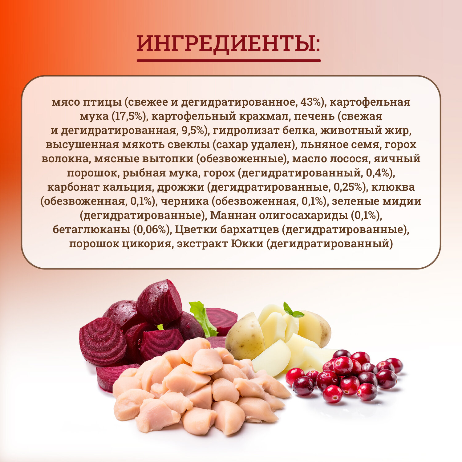 | Ингредиенты | мясо птицы, картофельная мука, крахмал, печень, витамины, минералы |