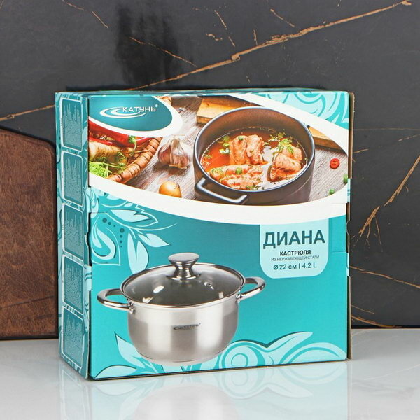 Лучшие цены. Артикул: 0715-559. Материал: Нержавеющая сталь, Диаметр: 22 см., Объем: 4200 мл., Вес: 1500 гр., Серия: Диана, Катунь Диана, Тип плиты: Для газовой плиты, Размер упаковки: 27 x 13.5 x 27 см., Цвет: Хромированный, Рисунок: Нет, Съёмная ручка: Нет, Крышка: Да, Материал крышки: Стекло, Тип покрытия: Без покрытия, Капсульное дно: Да, Диаметр дна, см: 18.5, Можно мыть в посудомоечной машине: Да, Особенность: Индукционная плита, Товар Каспи: Кастрюли. Магазины в вашем городе.
