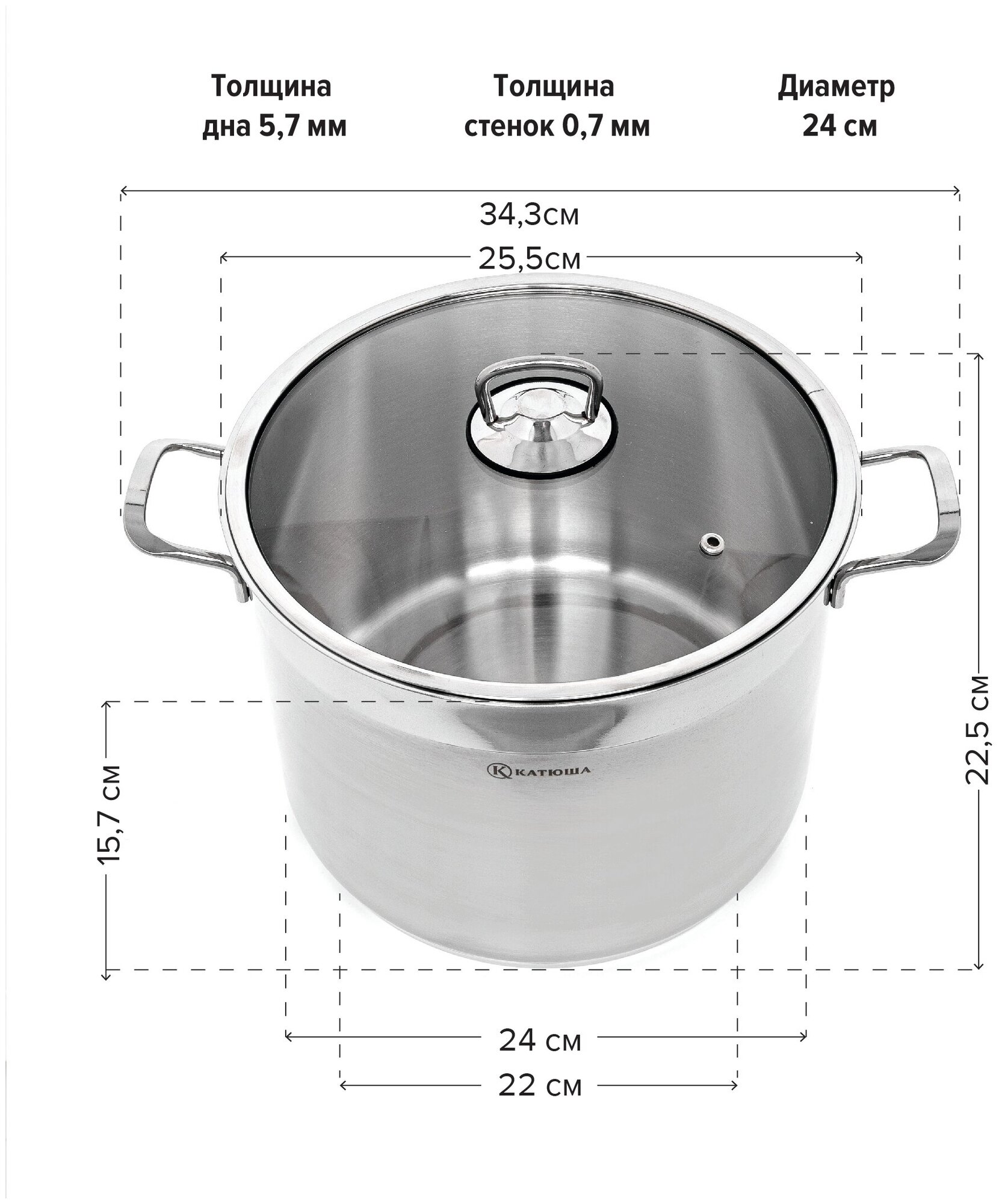 Лучшие цены. Цена за 1 шт. Кастрюля Катюша София, нержавеющая сталь, со стеклянной крышкой, 7 л, 24 см Кастрюля подходит для приготовления супов, жарки, пассеровки и тушения. В кастрюле можно приготовить разнообразные блюда из мяса, рыбы, птицы и овощей. Кастрюля оснащена крышкой из жаропрочного стекла со стальным ободом, имеет пароотвод, что позволяет контролировать процесс приготовления пищи. Имеет трехслойное капсульное дно с теплораспределительным слоем. Магазины в вашем городе.