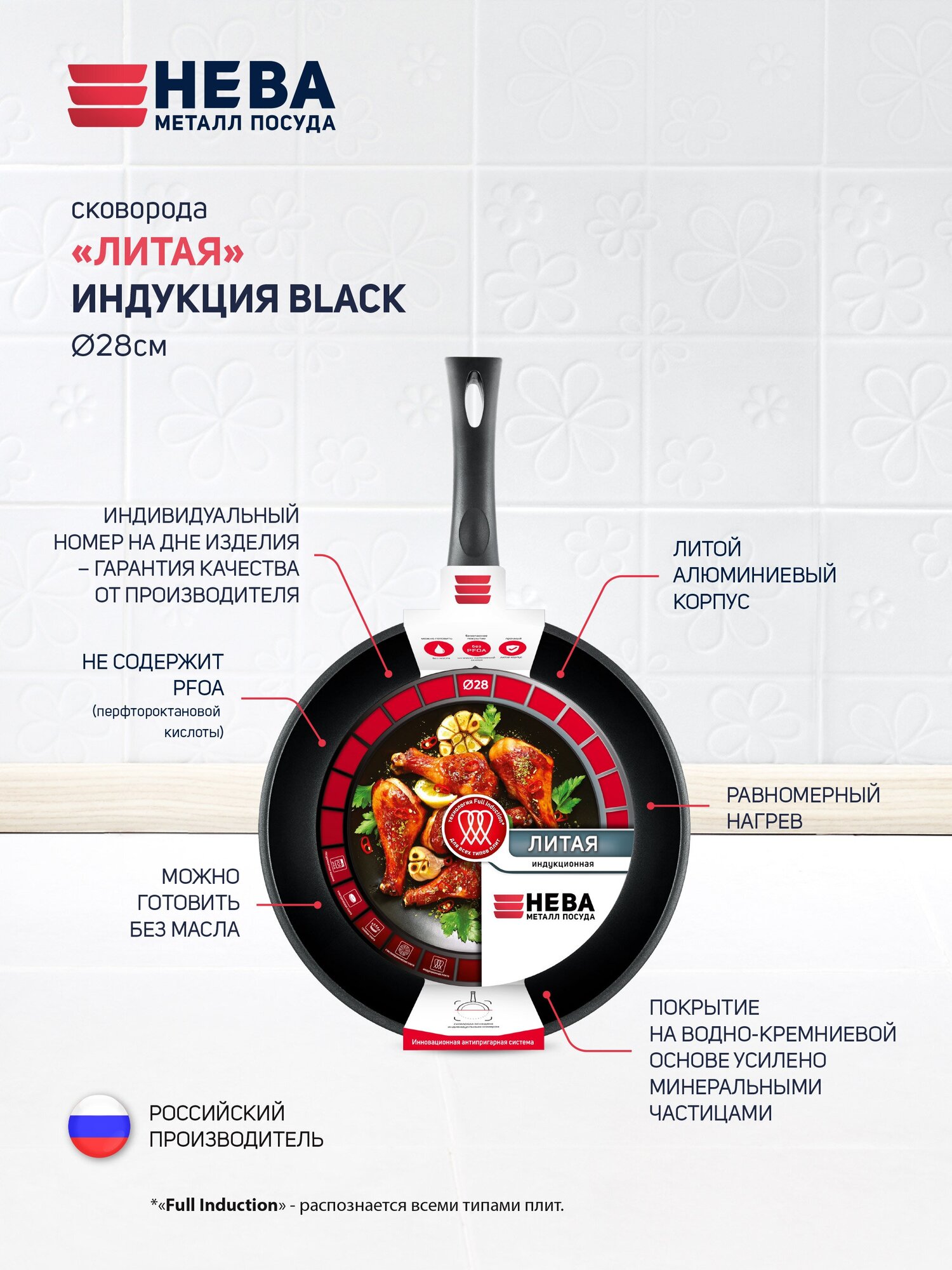 Сковорода для индукционной плиты литая с антипригарным покрытием Нева Металл Посуда "Индукционная" Черная 28 см со съемной ручкой и без крышки
