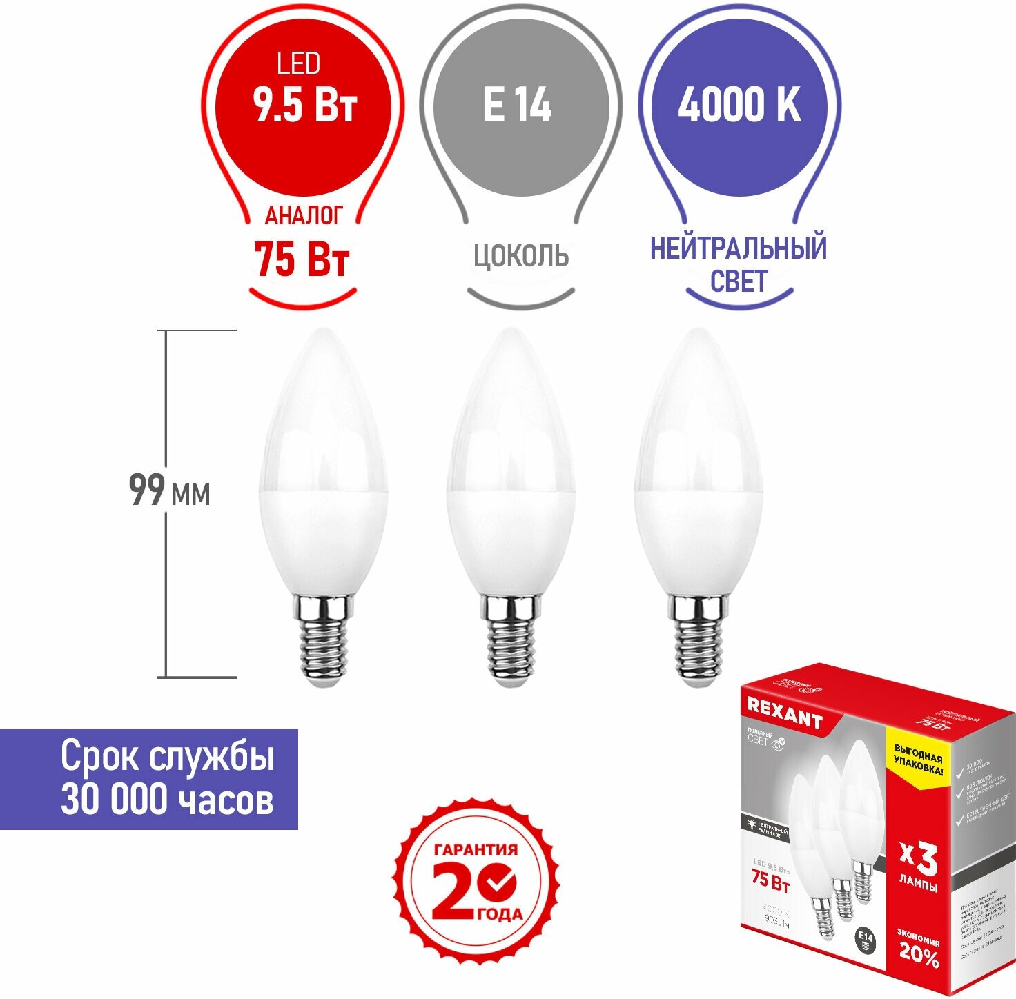REXANT Лампа светодиодная Свеча CN, 9.5 Вт, E14, 4000 K, нейтральный свет, 3 шт. 604-024-3