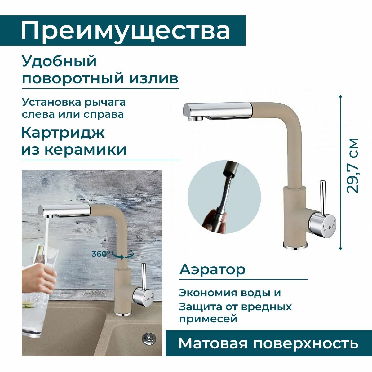 Смеситель для кухни с выдвижным, поворотным, высоким изливом ALVEUS SIROS - P G55 BEIGE матовый бежевый