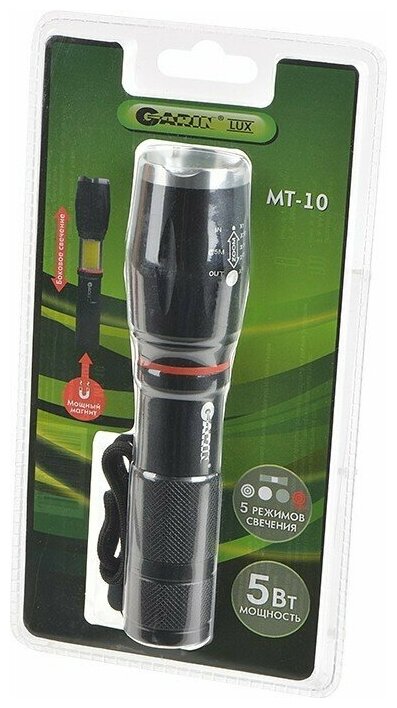 Лучшие цены. GARIN LUX MT-10 фонарь с двумя источниками света: LED светодиод Т6 в головной части фонаря (светит на дальнее расстояние) и светодиоды СОВ на боковой части (освещают на близком расстоянии). Технические характеристики: Корпус из алюминия Мощность светодиодов Т6 5Вт и COB 5Вт Световой поток 1000 люмен 5 режимов свечения: 100%, 50%, режим «стробоскоп», боковое свечение, стробоскоп красным светом Время свечения до 7 часов Мощный магнит Тип питания: 3*AAA/1*18650 (в комплект не входят). Магазины в вашем городе.