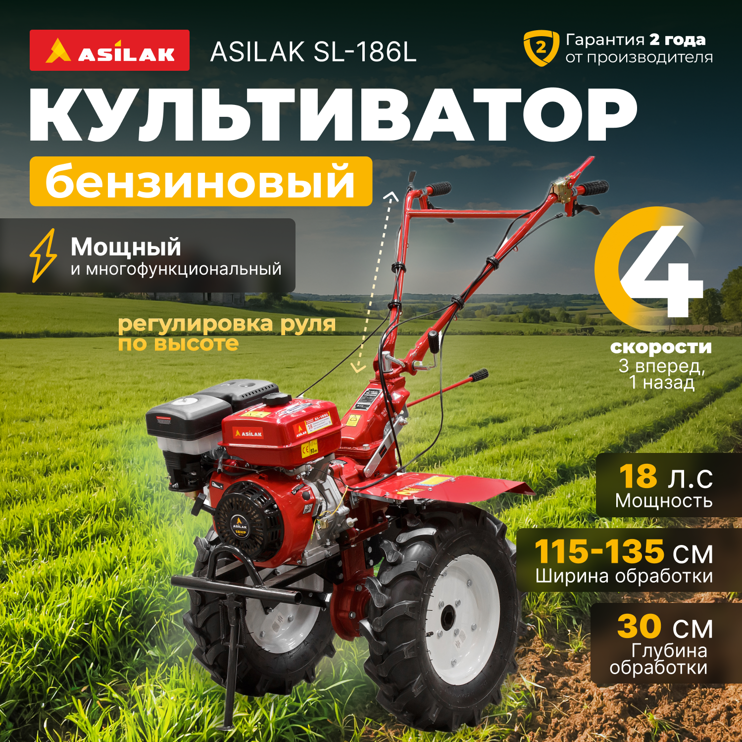 Культиватор бензиновый ASILAK SL-186L колеса 6.50-12 (18 л.с., 4 скорости вперёд - пониженная скорость, шир. 135 см, колеса 6.50-12, без ВОМ, передач
