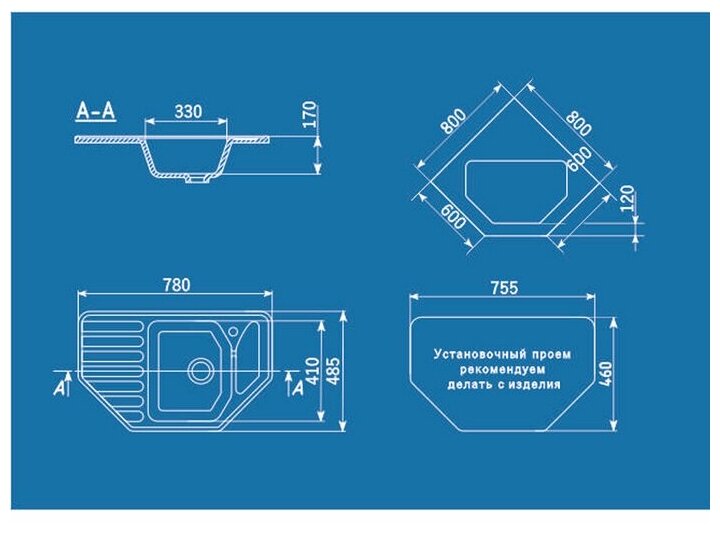 Кухонная мойка U-109 780*490мм угловая (341) ультра-белый