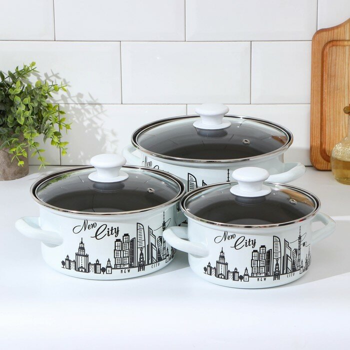 Лучшие цены. Набор кастрюль «Новый город», 3 предмета: 1,5 л, 2,3 л, 3 л. В наборе, шт.: 3. Капсульное дно: Нет. Крышка: Да. Материал: Эмалированная сталь. Материал крышки: Стекло. Объём, л: 2,3, 3, 1,5. Особенность: Индукционная плита. Размер упаковки: 24 см x 24 см x 29 см. Рисунок: Да. Состав набора: Кастрюля. Страна производителя: Россия. Съёмная ручка: Нет. Температурное ограничение: Нет. Магазины в вашем городе.