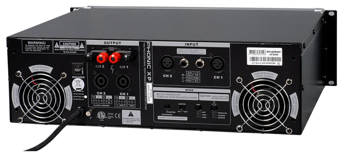 Усилитель PHONIC XP 2000 V11 Усилитель мощности 2 x 960 Вт /2 Ом, 2 x 600 Вт/4 Ом, 2 x 400 Вт / 8 Ом, 1920 Вт мост / 4 Ом.