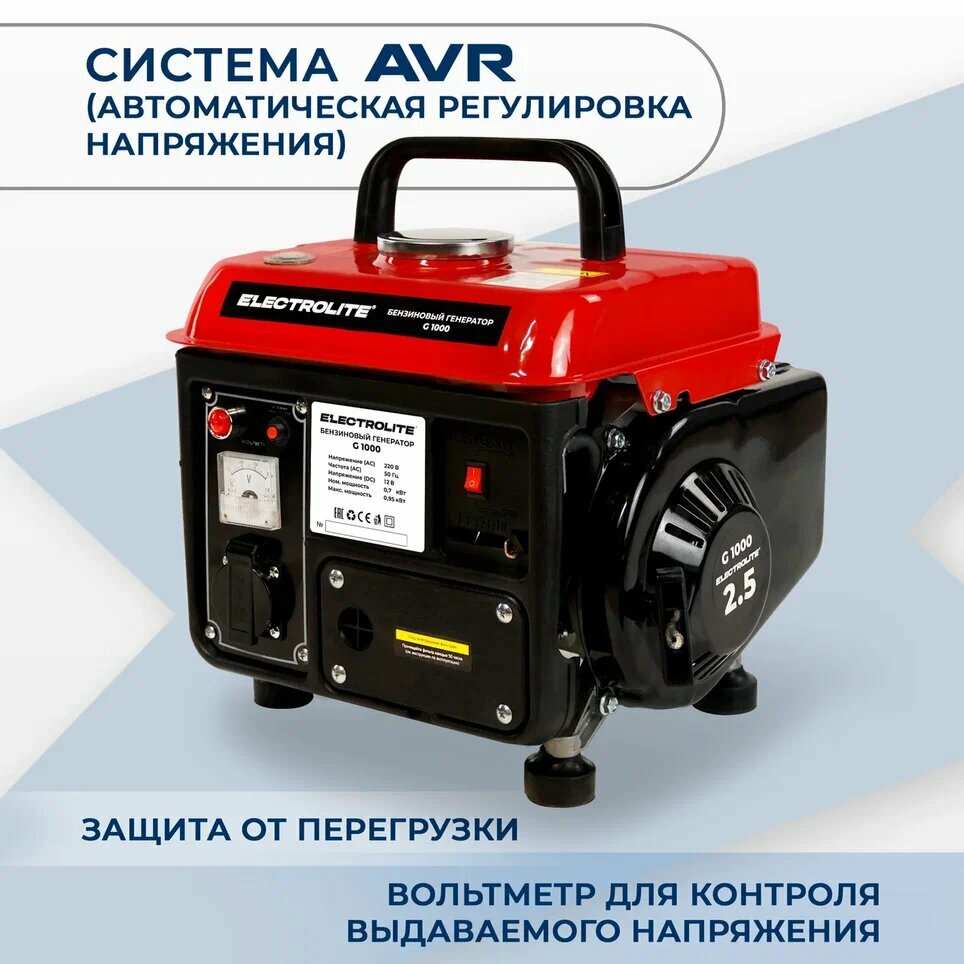 Генератор бензиновый Электрический Electrolite G 1000 ( 1.2 кВа макс. нагрузка , 220 В / 12 В, 0.7 / 0.95 кВт, 50 Гц, 2.5 л.с, 2 тактный двигатель )