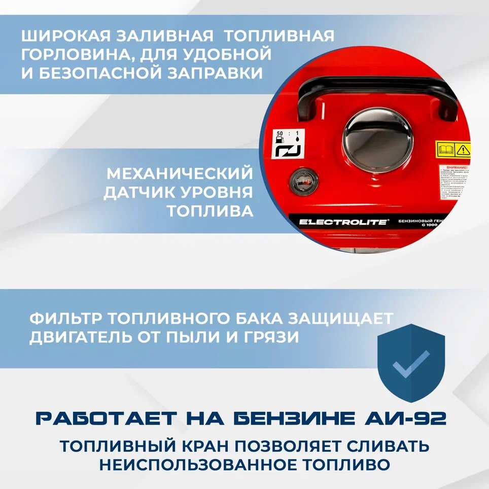 Лучшие цены. Генератор бензиновый Electrolite G1000 - это надежный и экономичный источник энергии для обеспечения аварийного электропитания в условиях отсутствия сети. Идеально подходит для использования в загородных домах, дачах, коттеджах и личном хозяйстве. Генератор оснащен двухтактным двигателем мощностью 2,5л. с, который работает на бензине АI-92. Емкость топливного бака составляет 4,2л, что обеспечивает время работы до 10,5ч. Магазины в вашем городе.