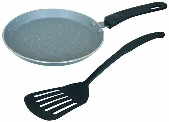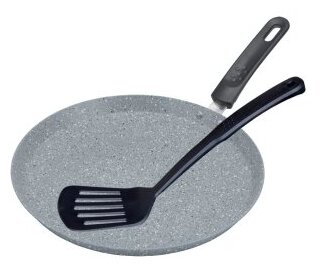 Лучшие цены. Алюминиевая сковорода для блинов. Нейлоновая лопатка в комплекте. Мраморное антипригарное покрытие, можно жарить или обжаривать с небольшим количеством масла. Подходит для всех типов бытовых плит. Магазины в вашем городе.