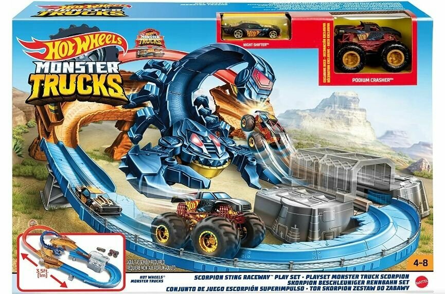 Лучшие цены. Hot Wheels Monster Trucks Track Scorpion Attack GNB05 Этот фантастический игровой набор с ускорителем позволит вам испытать удовольствие от гонок на монстр-траках Hot Wheels в масштабе 1:64 и игрушечном автомобиле Hot Wheels в масштабе 1:64. Собранный набор имеет длину более 100 см! победите скорпиона! Избежать клешней и укуса скорпиона будет непросто! Дети могут переехать игрушечной машинкой через хвост скорпиона или столкнуться с ней монстр-траками, чтобы выиграть. Магазины в вашем городе.