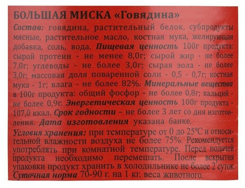 | Ингредиенты | телятина, рубец, субпродукты, белок, масло, вода |