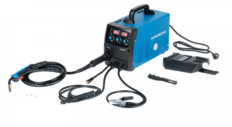 Лучшие цены. Аппарат сварочный инверторный MIG/MAG +MMA NORDBERG WMI161 (220V) Cварочный инверторный полуавтомат, создан с использованием усовершенствованной технологии IGB и предназначен для сварки проволокой в среде защитных газов MIG и MAG ( MIG Metal Inert Gas/ MAG Metal Active Gas). Аппарат поддерживает режим ручной дуговой сварки электродом – MMA (Manual Metal Arc). Скорость подачи проволоки контролируется с помощью регулятора, расположенного на передней панели аппарата. В механизме подачи 2 ролика. Магазины в вашем городе.