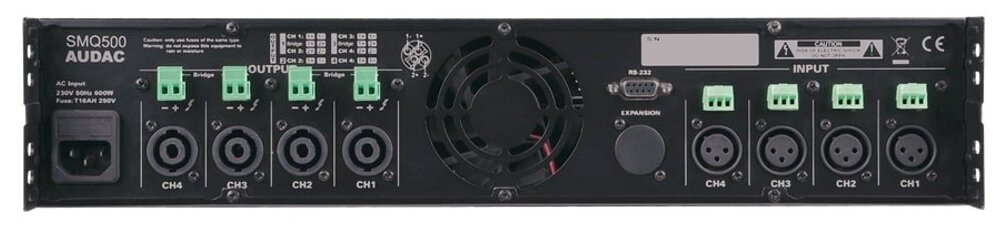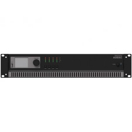 Усилитель AUDAC SMQ500 Четырехканальный низкоомный усилитель с DSP. Опционально предусмотрена установка карты интерфейса DANTE. Мощность (@4 Ом): 4 x 500 Вт.