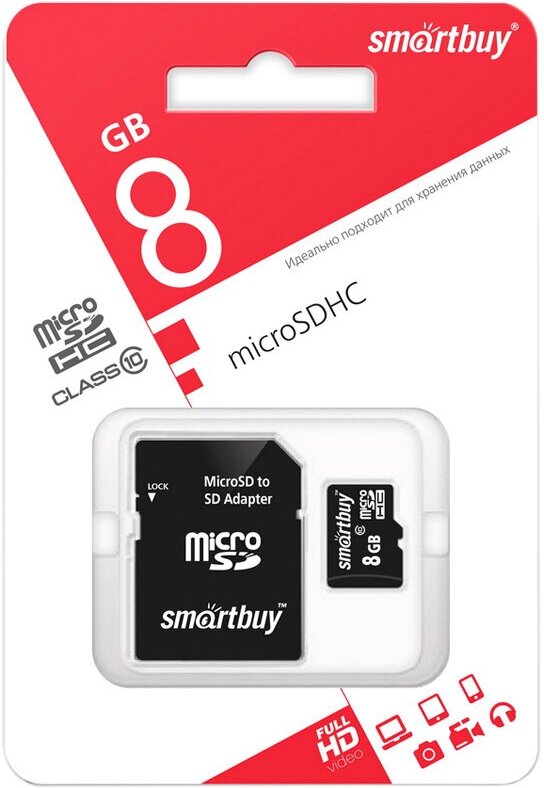Карта памяти microSDHC SmartBuy 8Gb, Class 10, 10Мб/сек (с адаптером SD), 1шт. (SB8GBSDCL10-01)