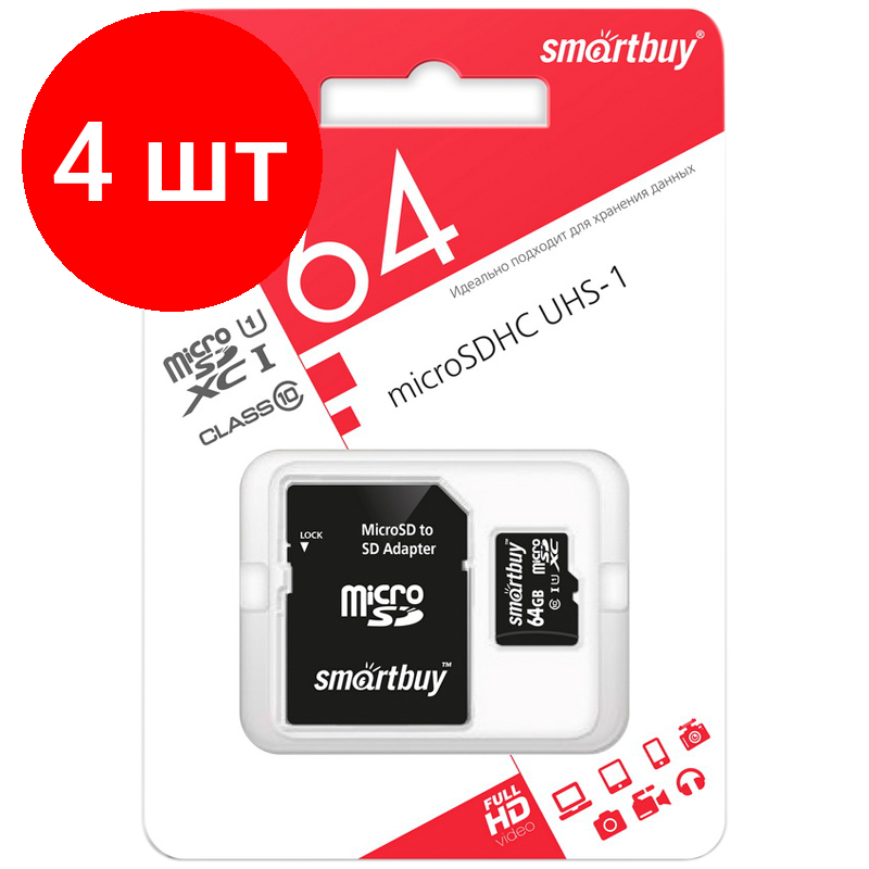 Карты памяти Комплект 4 шт, Карта памяти SmartBuy MicroSDXC 64GB UHS-1, Class 10, скорость чтения 60Мб/сек (с адаптером SD)