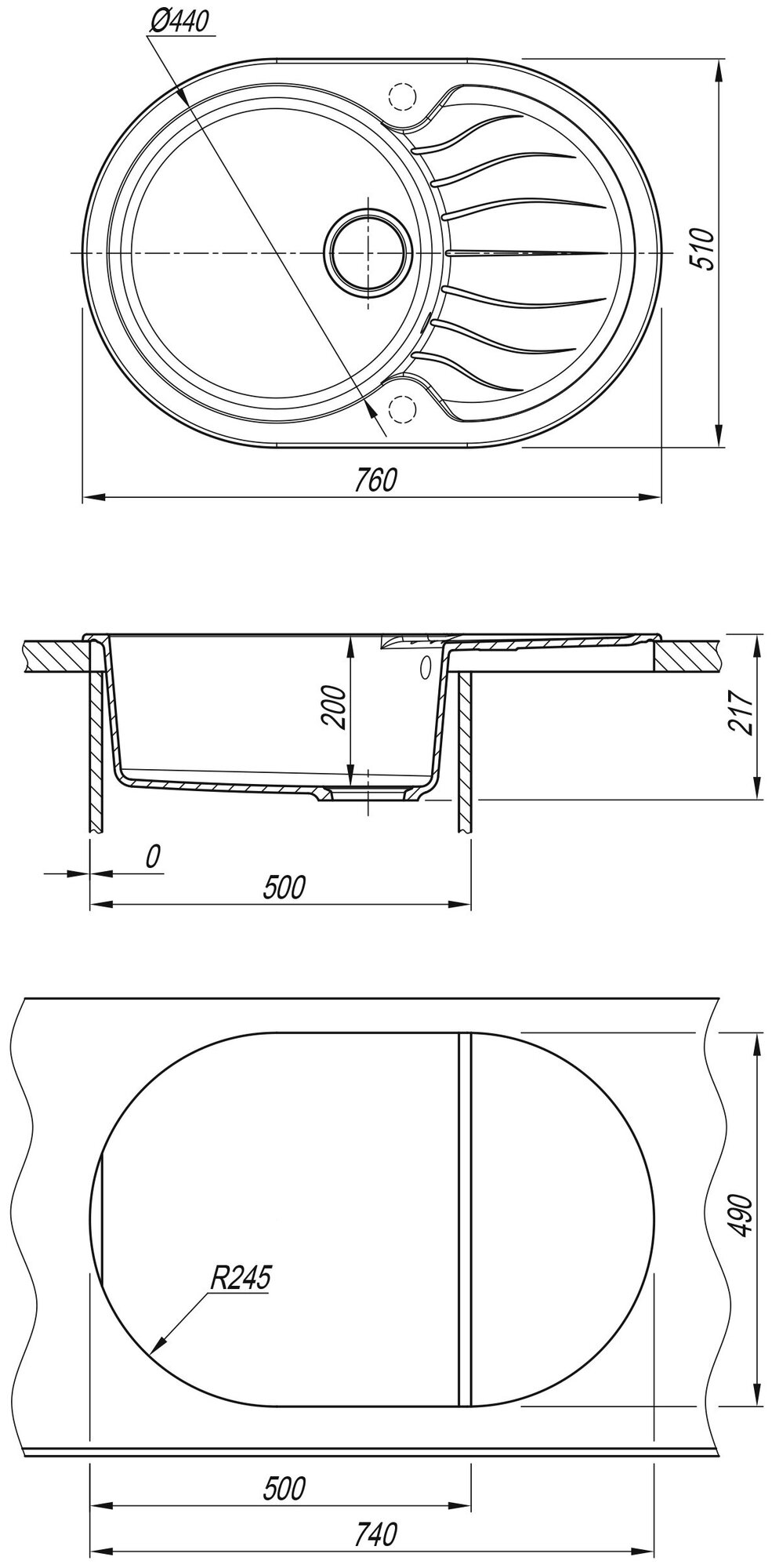 Мойка для кухни врезная каменная Dr. Gans БЕРТА-760, цвет черный, с крылом, овальная, 760х510х217 мм
