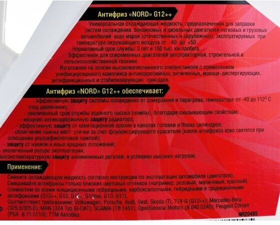 Лучшие цены. Антифриз «NORD» G12++ – высококачественная охлаждающая жидкость, изготовленная на основе этиленгликоля по лобридной технологии, в основе компонентов которой лежат собственные разработки компании «химавто». ВСЕ антифризы «NORD» содержат дополнительный комплект присадок, обеспечивающих ЕЩЕ более мощную защиту от кавитации Антифриз предназначен для заправки систем охлаждения автомобильных двигателей всех марок (отечественных и зарубежных). Магазины в вашем городе.