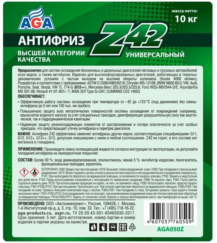 Лучшие цены. Универсальный антифриз зеленый готовый AGA Z42. Предназначен для систем охлаждения бензиновых и дизельных двигателей легковых и грузовых автомобилей всех марок, а также автобусов. Идеален для высокофорсированных двигателей, работающих в тяжелых динамических условиях с частым выходом на высокие обороты коленчатого вала. Обеспечивает защиту всех металлических поверхностей системы охлаждения от кавитации. Магазины в вашем городе.