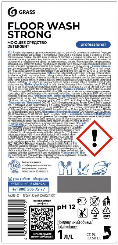 Лучшие цены. Щелочное низкопенное средство для машинной и ручной мойки водостойких полов Grass Floor Wash Strong 1.2 кг Назначение: концентрированное щелочное средство особо сильных загрязнений предназначено для мытья синтетических, виниловых и полимерных покрытий, поверхностей из линолеума, кафеля, асфальта, бетона, облицовочной плитки. Удаляет даже въевшиеся бытовые и уличные загрязнения, в том числе масложировые и органические. Магазины в вашем городе.