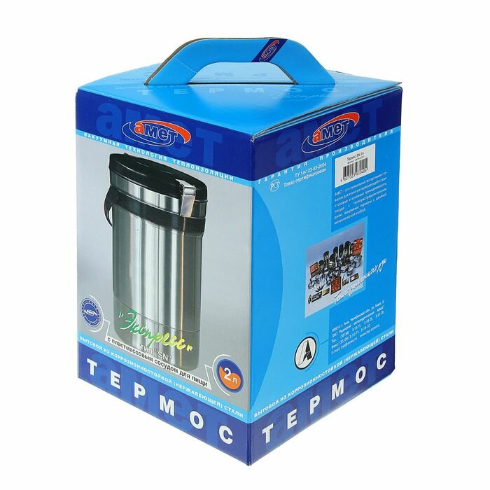 Лучшие цены. Термосы ТМ «Амет» изготавливают из коррозионно-стойкой стали. Этот материал переносит лёгкие удары и не боится вибраций. Изделия имеют двойную металлическую колбу с глубоким вакуумом, поэтому сохраняют тепло на долгое время. Используйте термос для еды "Экспресс" 1с474, 2 л, 72 °С, 6 ч дома, на даче, берите с собой на работу, рыбалку и охоту, в походы и путешествия. Магазины в вашем городе.
