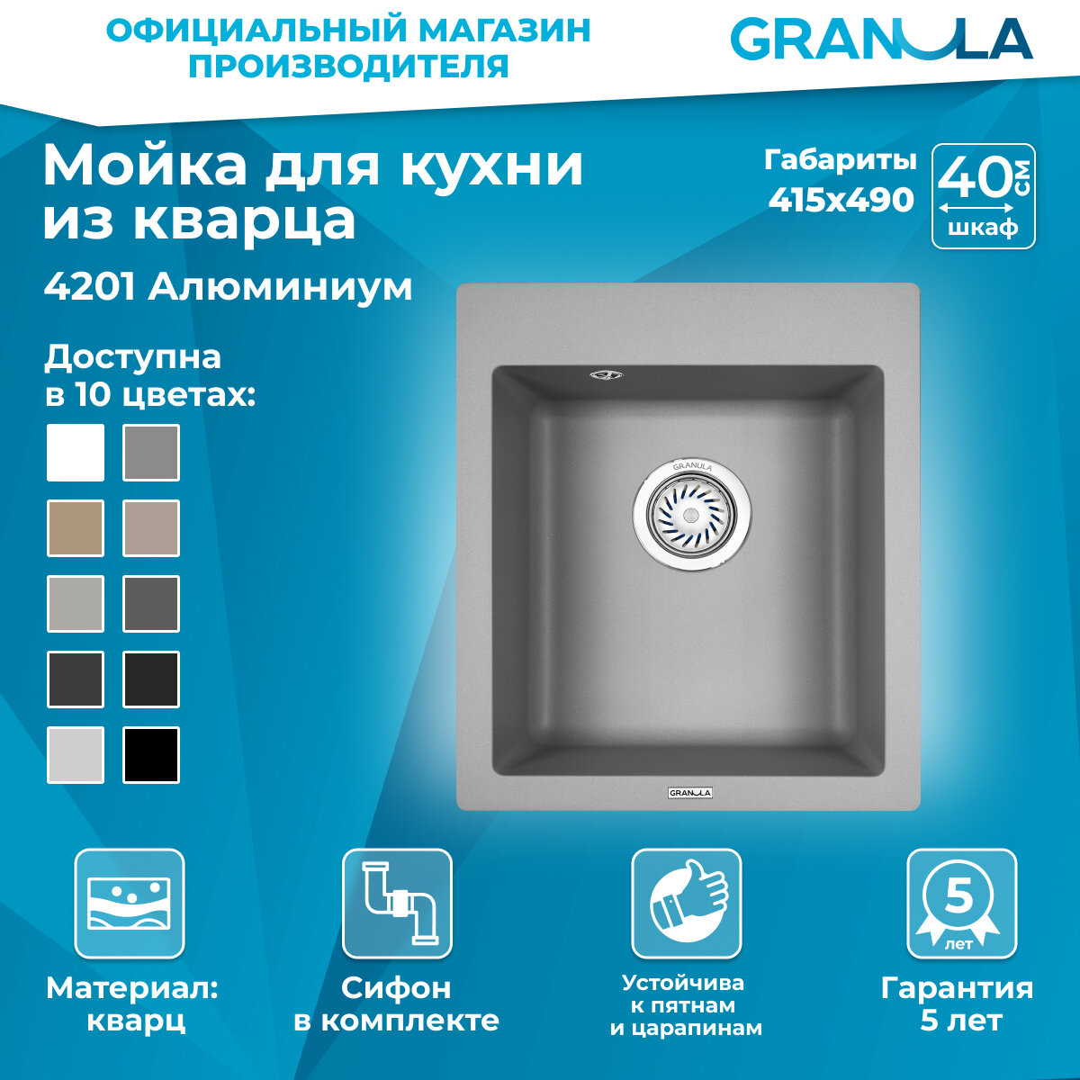 Кухонные мойки GRANULA мойка кухонная кварцевая GR-4451 455*460 мм алюминиум