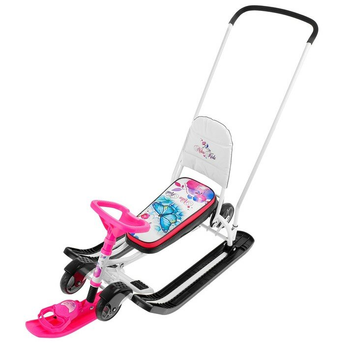 Санки Nika Kids Снегокат с колёсами «Тимка спорт 6 Бабочки», ТС6, с родительской ручкой, со спинкой и ремнём безопасности, цвет чёрный/белый/розовый