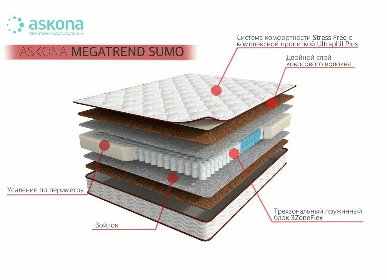 Анатомический матрас, Ортопедический матрас Askona Megatrend Sumo / Аскона Мегатренд Сумо, С зональным пружинным блоком, 200х195 см