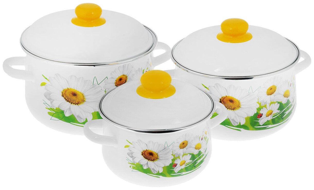 Набор эмалированной посуды 3 предмета "Ромашки-лето" белоснежный 2,0 л; 4,0 л; 5,5 л / набор кастрюль / набор кастрюль эмалированных