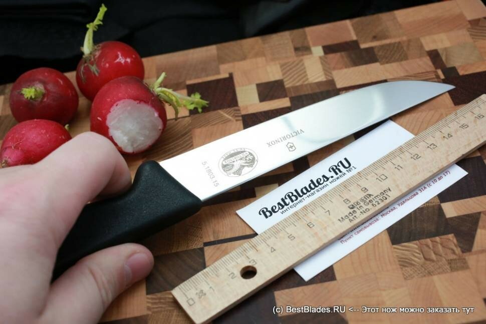 Лучшие цены. Материал лезвия: сталь прокатная, молибден-ванадиевая (X50 Cr Mo V 15); Материал рукояти: полипропилен; Длина лезвия: 15 см; Тип режущей кромки лезвия: двусторонняя симметричная; Назначение: для нарезки; Цвет: черный; Производство компании: Victorinox, Швейцария. Магазины в вашем городе.