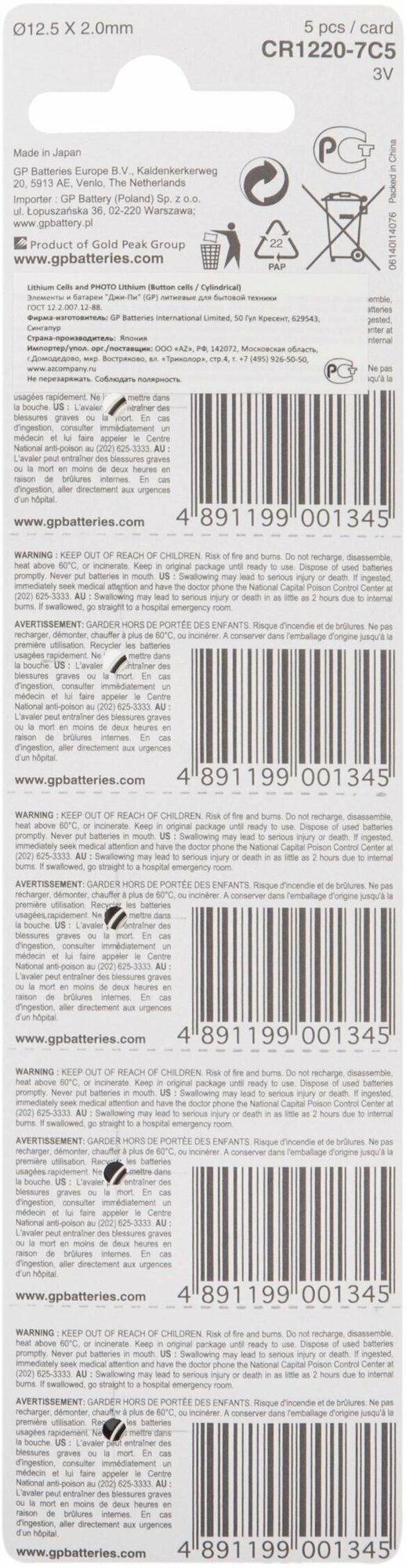 Дисковые литиевые батарейки GP (cr1220ra), 5 шт./уп. GP CR1220RA-7C5 100/2000