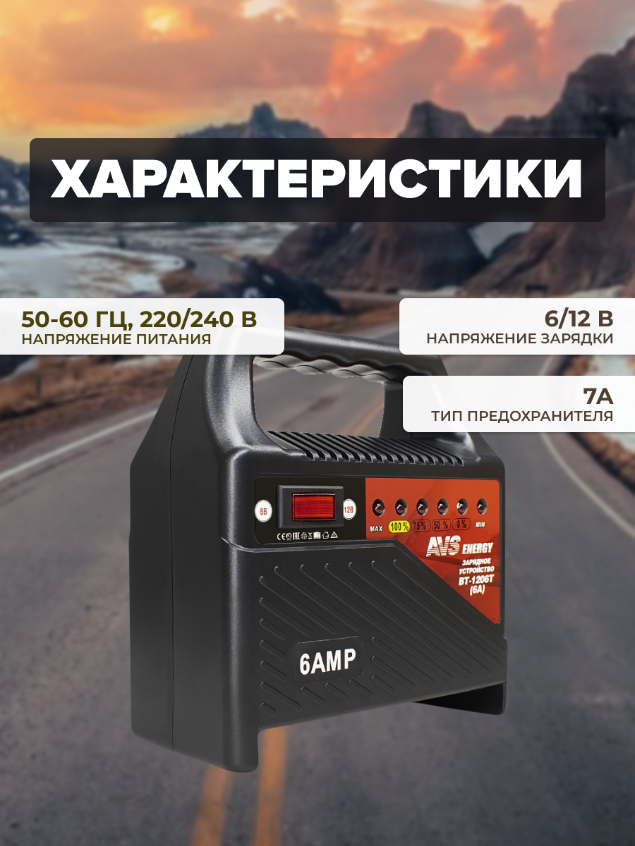 Лучшие цены. С наступлением холодов одна из типичных проблем, с которой часто сталкиваются автолюбители это разряженный аккумулятор автомобиля. После нескольких лет эксплуатации автомобиля мощности генератора не хватает для зарядки аккумулятора, в результате, автомобиль плохо заводится. Решить эту проблему Вам помогут автоматические зарядные устройства AVS. Характеристики: ► Напряжение зарядки: 6В/12В. ► Максимальный ток: 6A. ► Напряжение питания: 50-60 Гц, 220В/240В. ► Мощность:72Вт. Магазины в вашем городе.