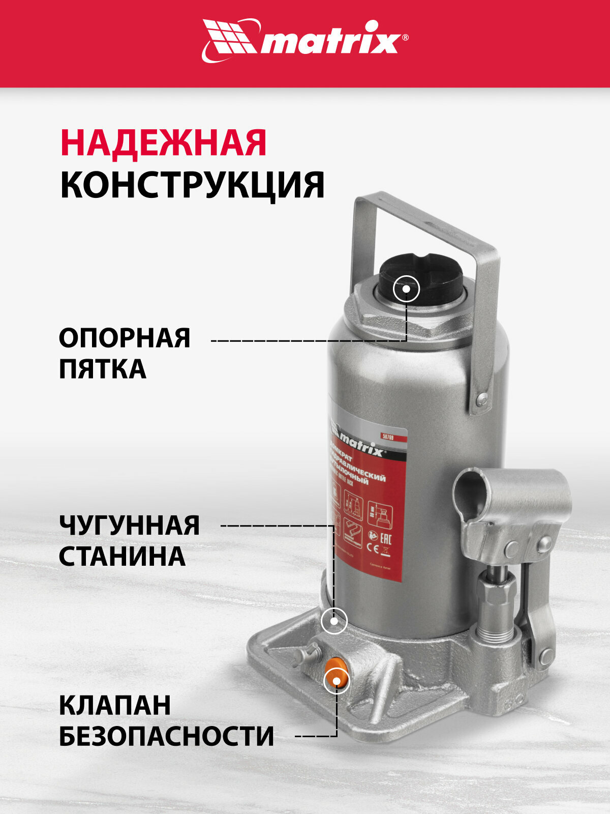 Домкрат гидравлический бутылочный Matrix 16 т, h подъема 230–460 мм 50769