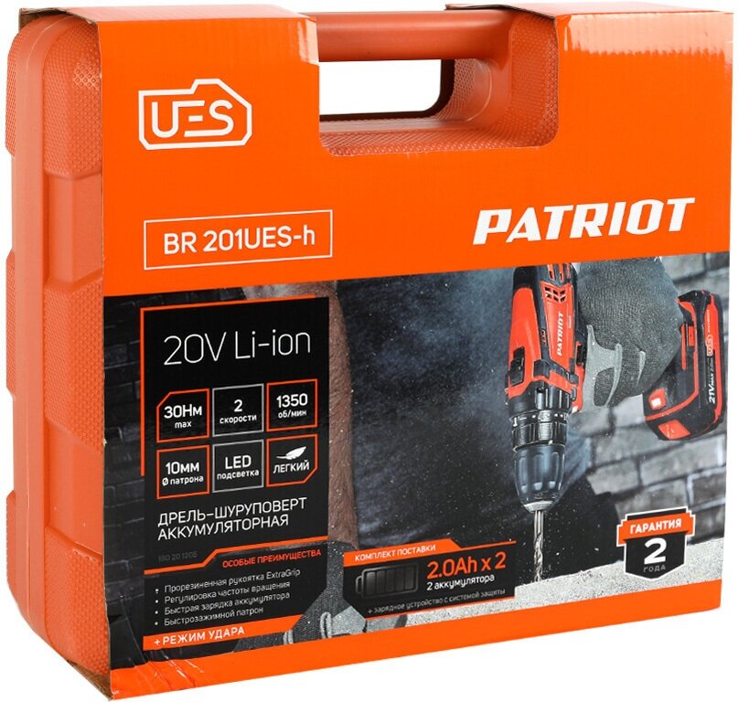 Дрель-шуруповерт аккумуляторная Patriot BR 201UES-H, 20 В, 2 x 2 Ач Li-ion, ЗУ