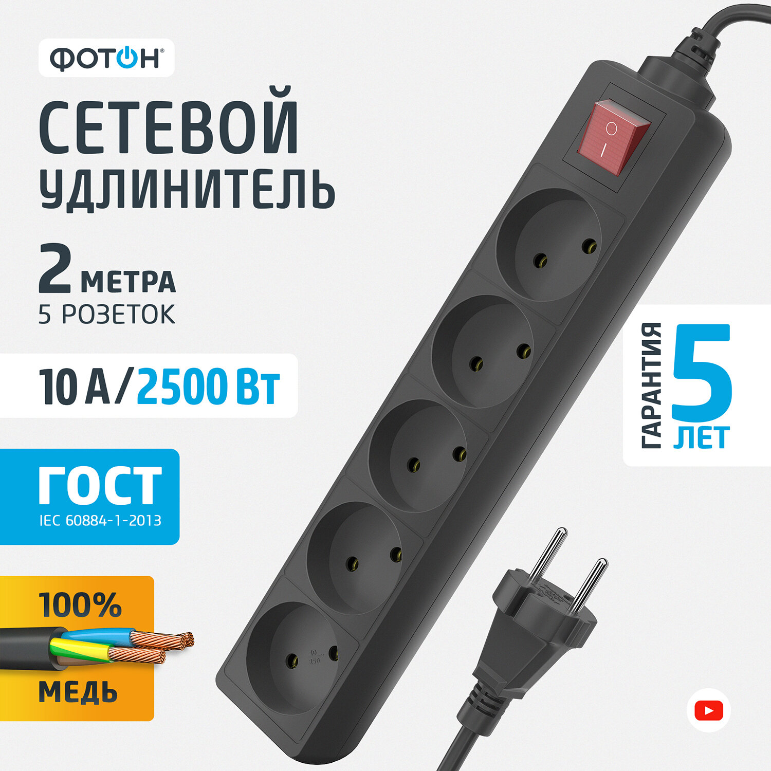 Удлинитель сетевой "фотон" 10-25S, 2м, 5 розеток, черный, ГОСТ