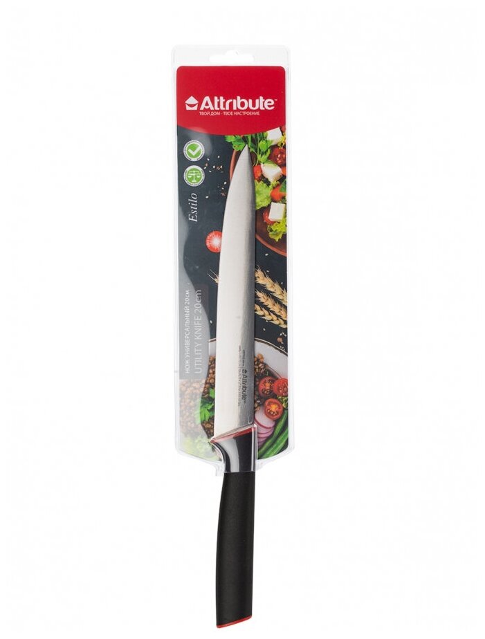 Лучшие цены. Нож ATTRIBUTE Estilo 20см универсальный нерж. сталь, пластик. Нож универсальный 'Estilo' является удобным инструментов на каждой кухне. Лезвие из нержавеющей стали универсальной формы подходит для рубки и резки как мелких продуктов, так и мяса. Пластиковая ручка более износостойкая в отличие от деревянной, так как пластик более удобен в уходе, легче и намного меньше скользит в руке. Можно мыть в посудомоечной машине. Магазины в вашем городе.