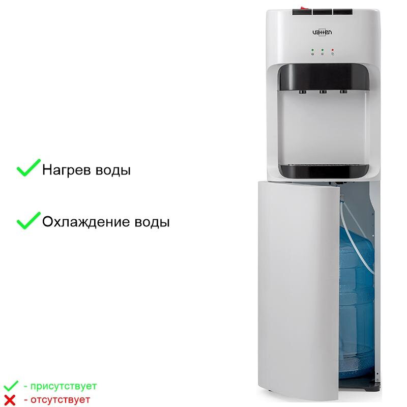 Лучшие цены. Классический кулер с нижней загрузкой бутыли. Цвет корпуса белый. Боковые панели металлические. Три крана, управление разливом воды при помощи трёх кнопок (горячая, холодная и вода комнатной температуры). Бак горячей воды из нержавеющей стали, холодной воды из пищевого пластика. Кран горячей воды имеет "защиту от детей". Три LED индикатора (включение питания, индикатор нагрева, индикатор охлаждения - power, hot, frost). Магазины в вашем городе.