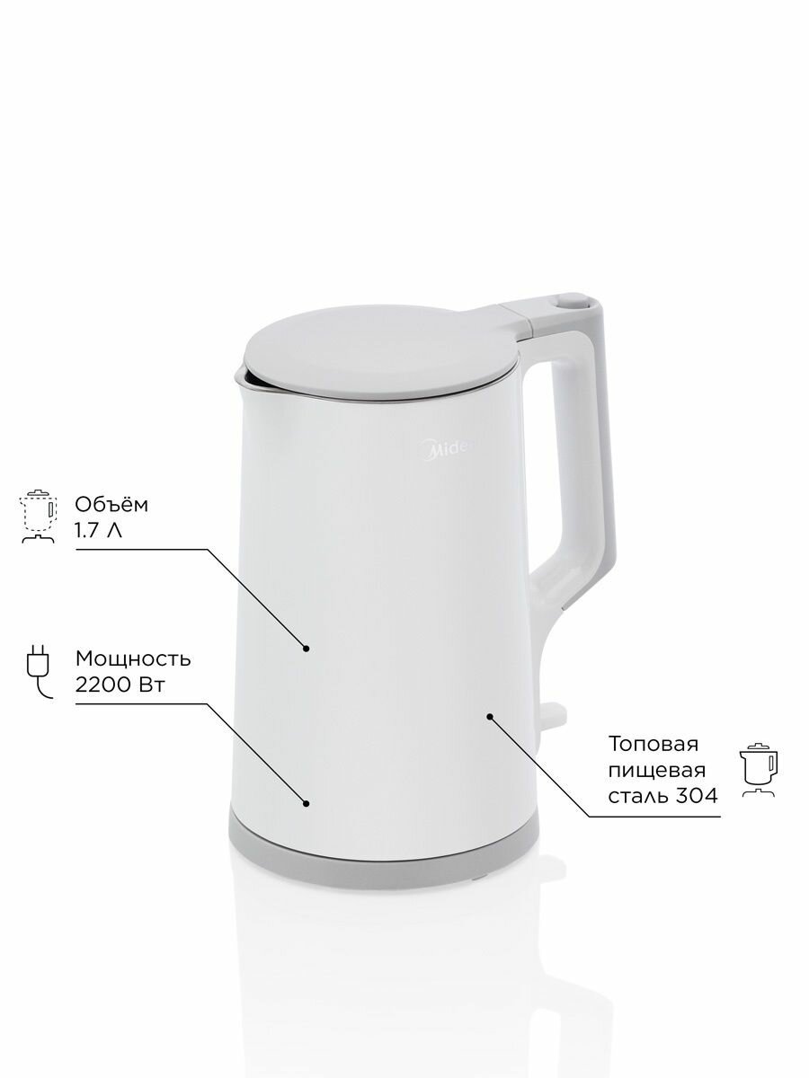Чайник электрический с двойными стенками Midea MK-8082, 2200 Вт, 1.7 л, фильтр, белый