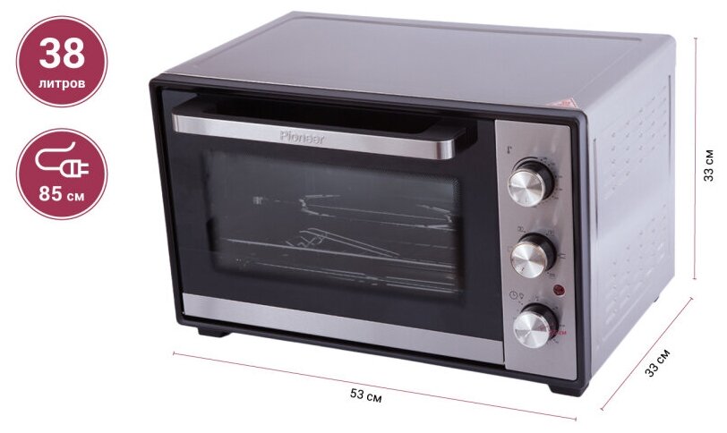 Электропечь Pioneer MO5020G, 38 л. с функцией конвекции, механическим управлением, электромеханическим вертелом, подсветкой, таймер 60 минут, 2 противня, 1600 Вт