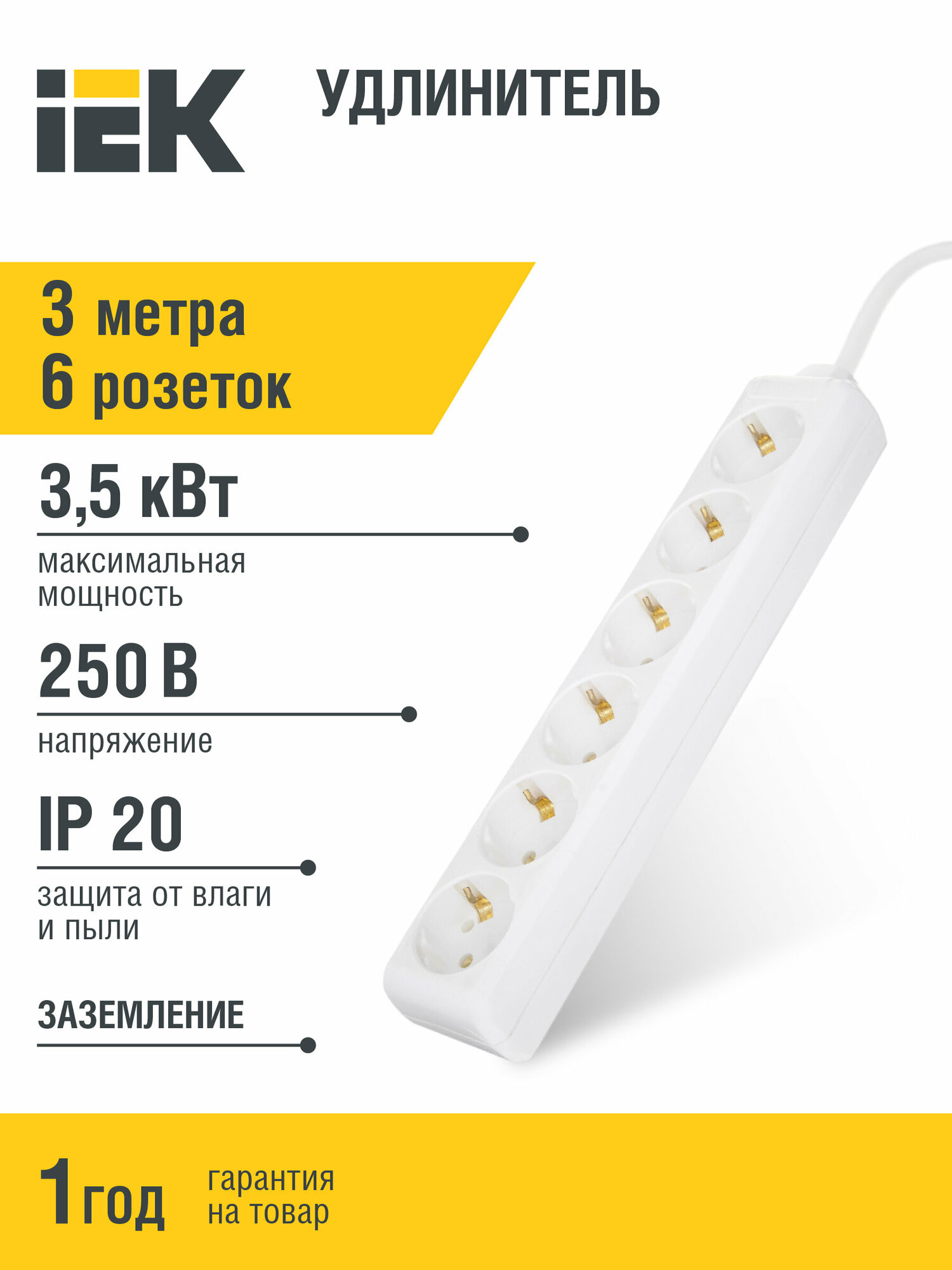 Удлинитель iEK 6 розеток с заземлением, 3 x 1 мм, 3 метра