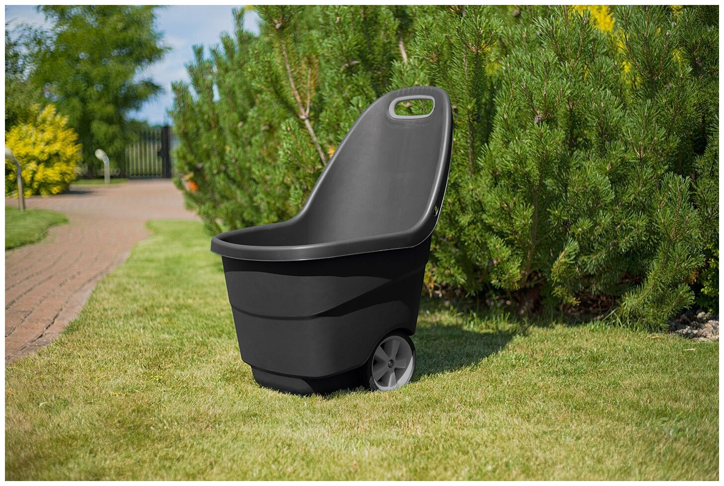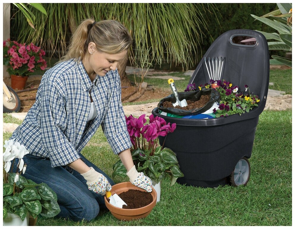Лучшие цены. Садовая тележка Изи Гоу XL объемом 62 литра - надежный помощник в саду. Тележку удобно везти за собой одной рукой. Садовая тележка Easy Go XL выполнена из прочного пластика c большими прорезиненными колесами, поэтому она легкая, но выдерживает большой вес. Кроме того, она не выцветает не солнце и не ржавеет. Садовую тележку можно использовать для множества разных целей: для сбора урожая или компоста, перевозки стройматериалов или гибких ведер с водой. Магазины в вашем городе.