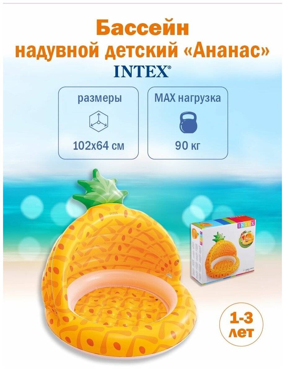 Лучшие цены. Бассейн надувной Ананас Intex 58414. Собственный бассейн с надувным дном – ни с чем не сравнимое удовольствие! Как бы высоко ни загоняло лето столбик термометра, вам все нипочем, ведь личный водоем с освежающей водой всегда под рукой: бултых. и вы наверху блаженства. И если взрослые позволить себе такое развлечение могут не всегда, то детский бассейн с навесом – приобретение вполне доступное. Магазины в вашем городе.