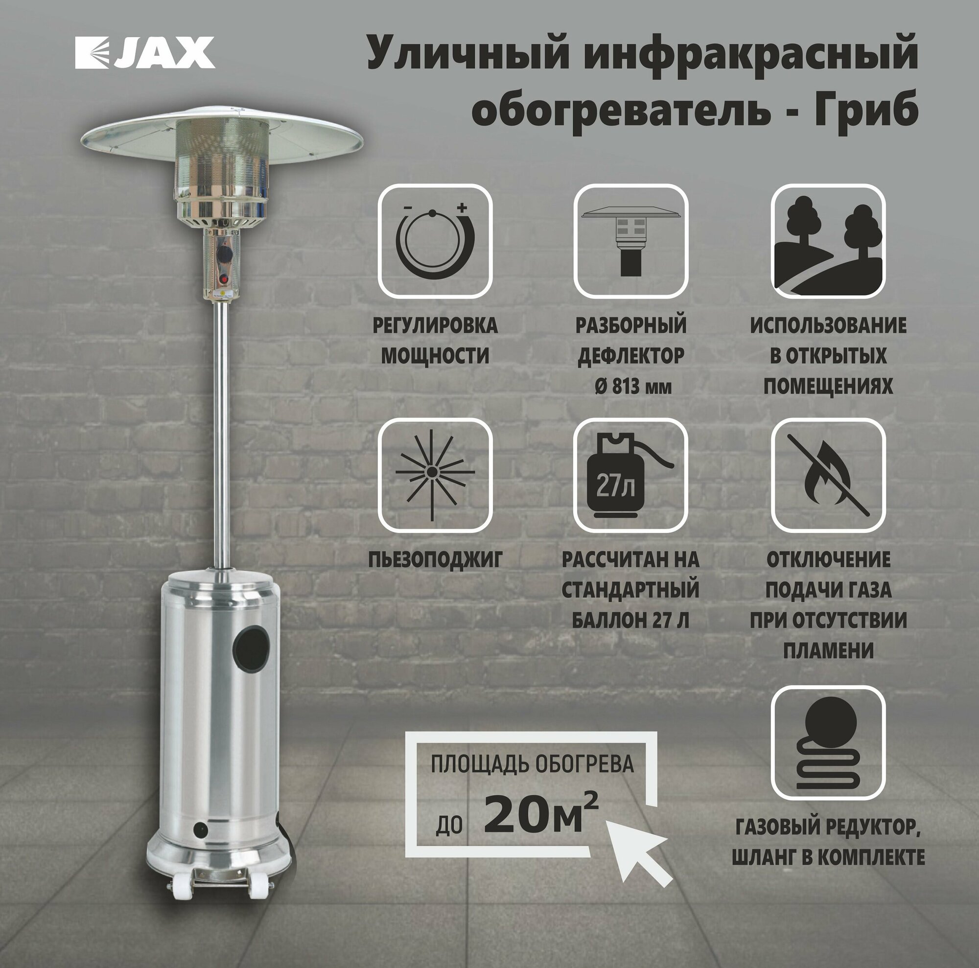 Лучшие цены. Уличные газовые обогреватели JAX предназначены для обогрева открытых площадок : украшение входных групп, обогрев уличных кафе и ресторанов, освещение и обогрев веранд и открытых участков , декор и обогрев в зимних шатрах, применение на открытых загородных мероприятиях, больших залах и т. д. Уличные газовые обогреватели JAX имеют многоуровневую систему безопасности : защита от опрокидывания, перегрева и защита от потухшего пламени. Магазины в вашем городе.