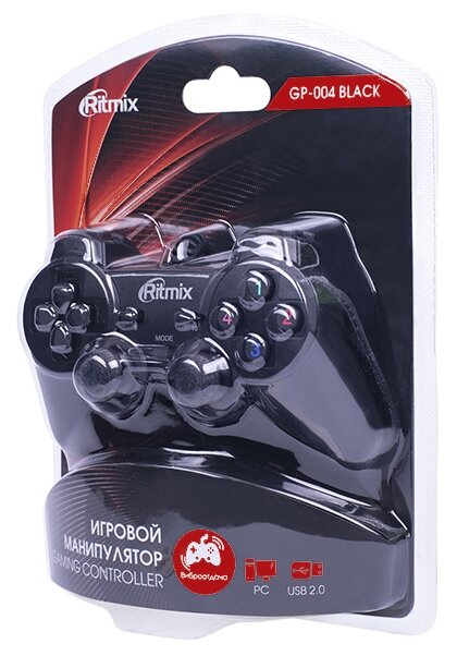 Лучшие цены. Геймпад Ritmix GP-004, 16 кнопок , usb , чёрный 80000954 Проводной игровой манипулятор для персональных компьютеров и ноутбуков. Оснащён двумя аналоговыми стиками и функцией виброотдачи. Характеристики: Тип товара: геймпад Производитель: Ritmix Модель: GP-004 варианты внешнего вида чёрный функция виброотдачи вес 210 г количество кнопок 16 совместимость* с Windows разъём конструкция разъёма штекер USB тип A длина кабеля 1, 5 м. Магазины в вашем городе.