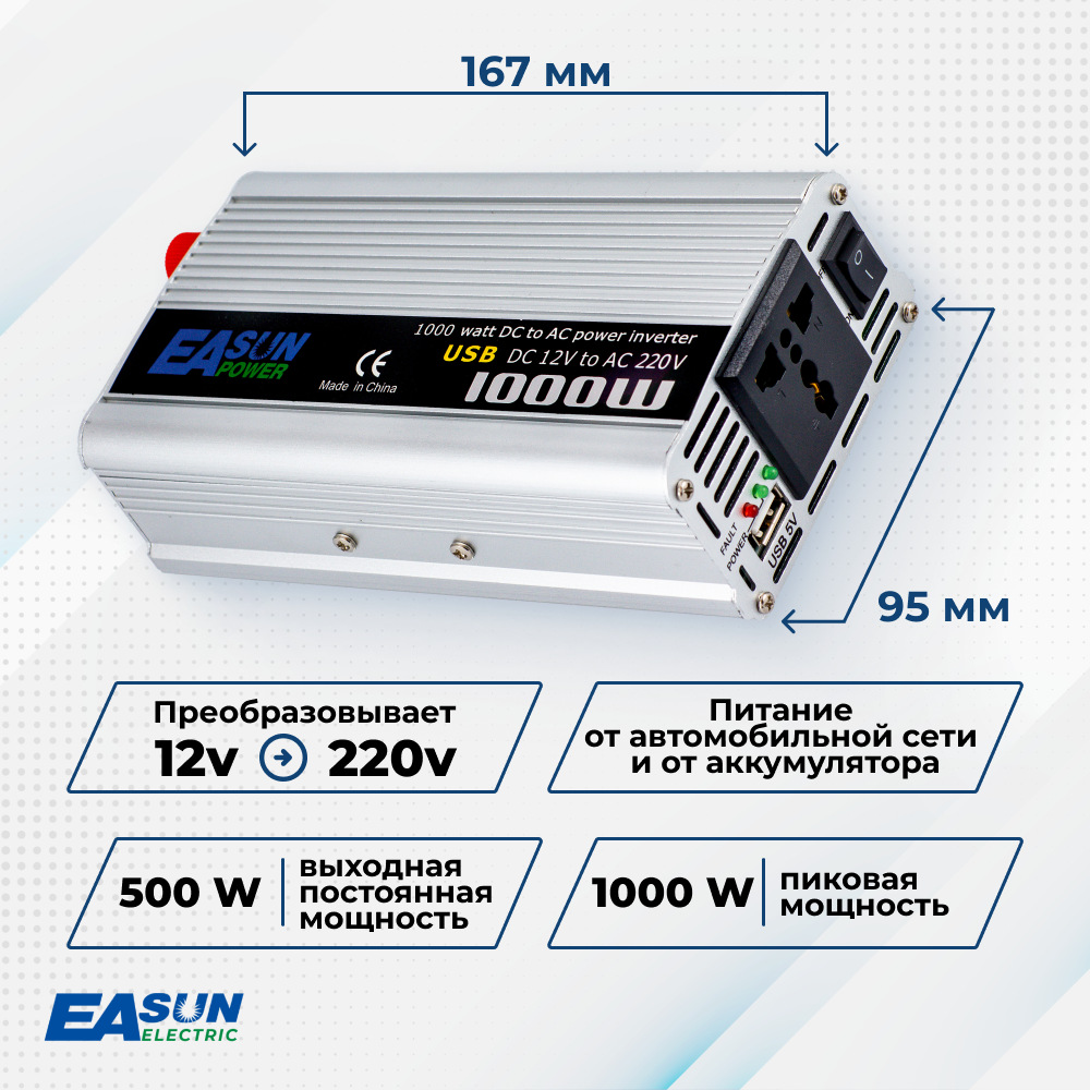 Автомобильные инверторы Инвертор автомобильный 12 220В Power Inverter, 1000 Вт. Преобразователь напряжения. К прикуривателю. Евророзетка и USB. Постоянная мощность до 500 Вт.
